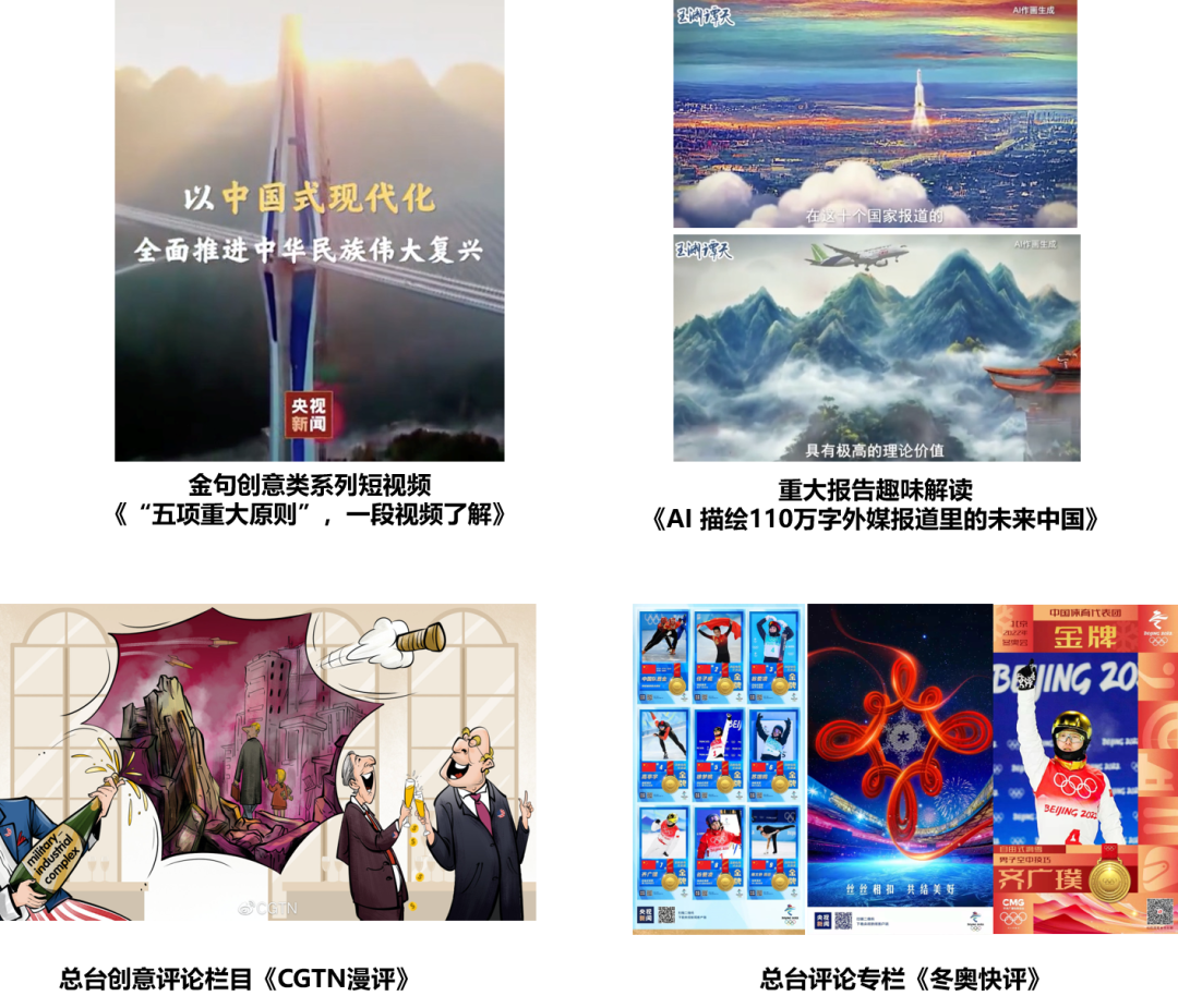 总台持续擦亮《央视快评》《国际锐评》《玉渊谭天》等言论评论品牌,同时借由《大湾区之声热评》《总台海峡时评》《台海快评》等区域评论栏目以及CGTN多语种评论,推动主流声音深入重点地区、覆盖国际舆论场。围绕全国两会、北京冬奥会等,总台还设置《两会热评》《冬奥快评》等评论专栏,聚拢垂直圈层受众。《CGTN漫评》《国际漫评》《诗评冬奥》等栏目使用大量漫画、海报、诗歌类评论,增加新闻评论的可看性与可读性。