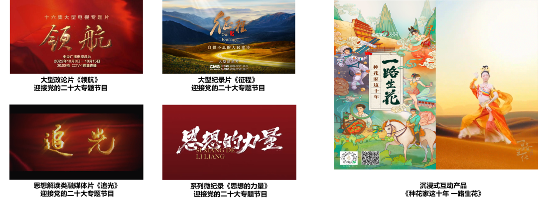 2022年,总台围绕重大主题,密集上线专题片、纪录片、特别报道等全类型节目片库。如围绕党的二十大,总台打造《领航》《征程》《追光》《思想的力量》《雄安 雄安》《中国大区域》《为了更美好的生活》《奋进新征程 建功新时代》《端牢中国饭碗》等一大批精品节目,覆盖理论阐释、军队建设、区域经济发展、乡村振兴等多个侧面。