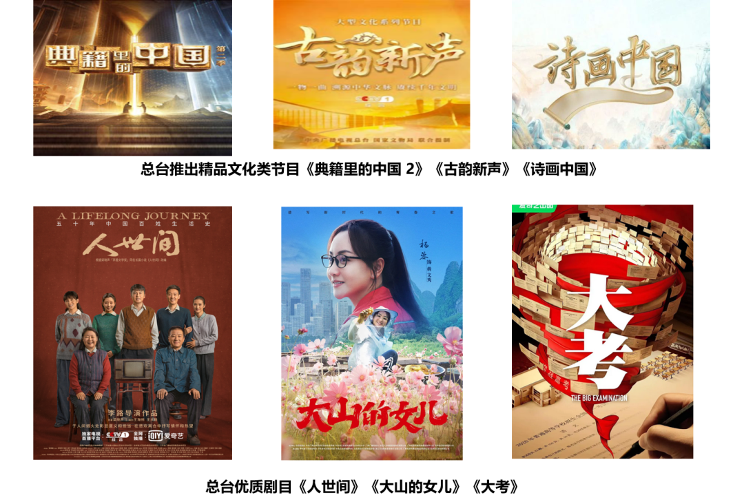 《鲜生史》《一馔千年》《荣宝斋》《艺术里的奥林匹克》等,使传统饮食、文玩、奥林匹克等文化走入大众视野。此外总台还全面布局春节、元宵、清明、端午、七夕、中秋、重阳等重要节日节点,打造全年不间断的文化盛宴;配套晚会推出的《古韵新声》系列节目,则通过一物一曲展现中华文明的源远流长。