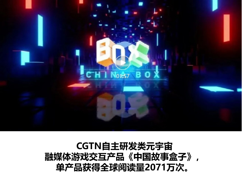 如2022年,CGTN基于Web3.0技术,融入AR、VR、网页3D引擎等,面向海外年轻受众推出融媒交互产品《中国故事盒子》,以未来感十足的形式讲述中国故事,获全球阅读量2071万次。